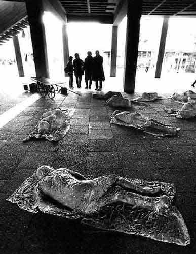 As part of the Lead Body Campaign in 1995, twelve so-called “lead bodies” were installed in public space. The sculptures were created from plaster casts of the artist’s own body and conceived as a duration performance.