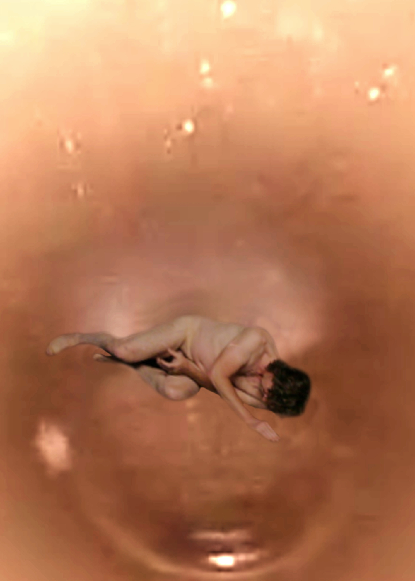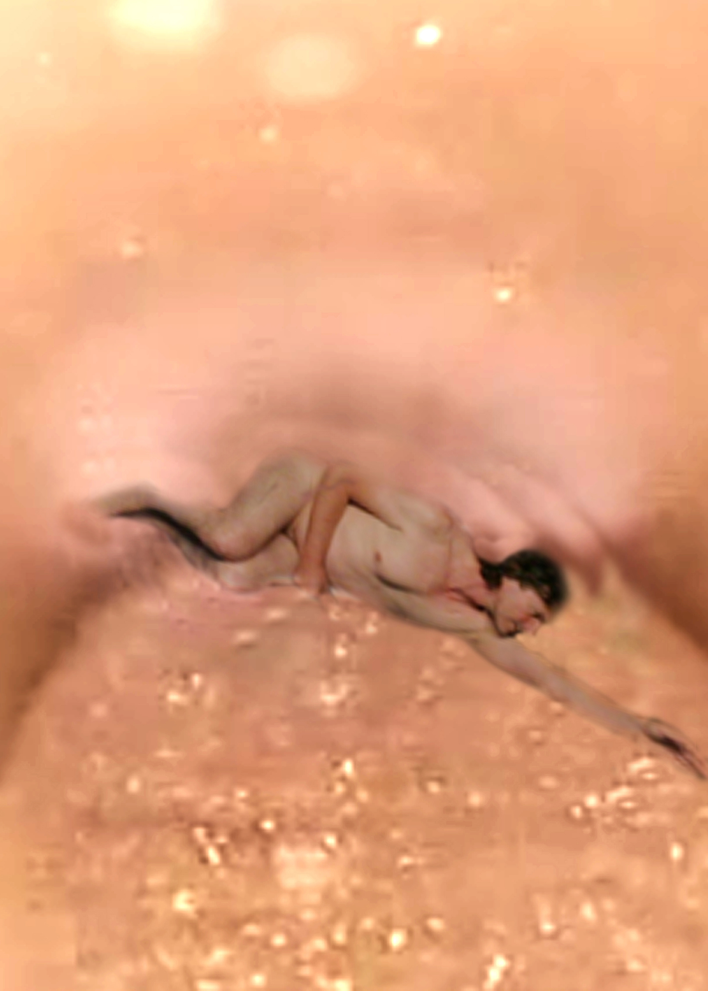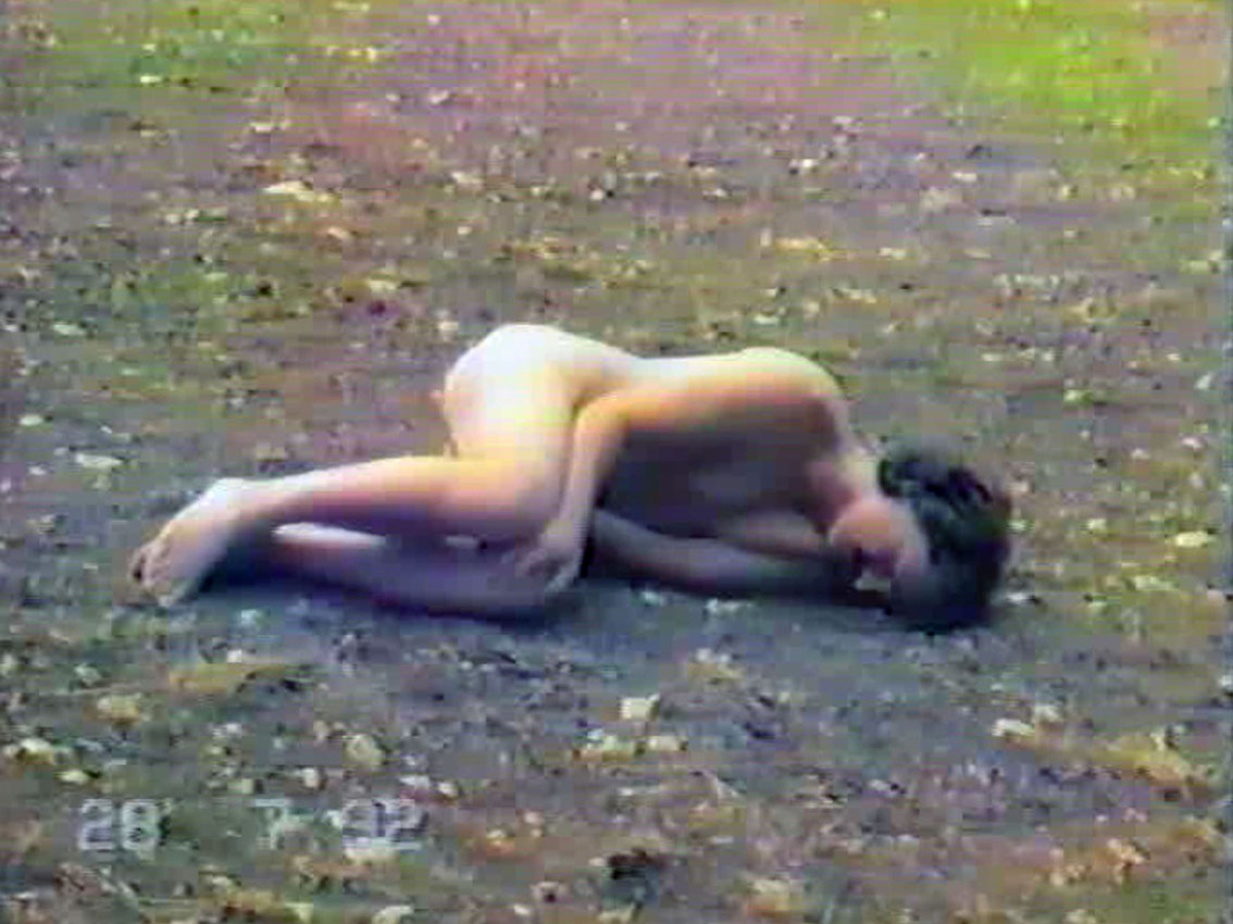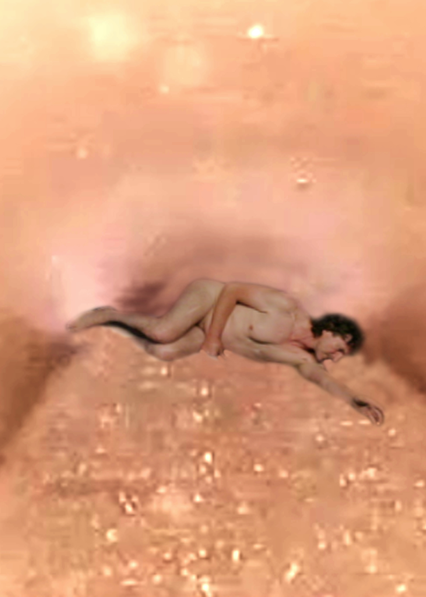 Elementary gestures — lying, sheltering, rising, standing, slipping away — mark transitions between protection, gravity, and dissolution.