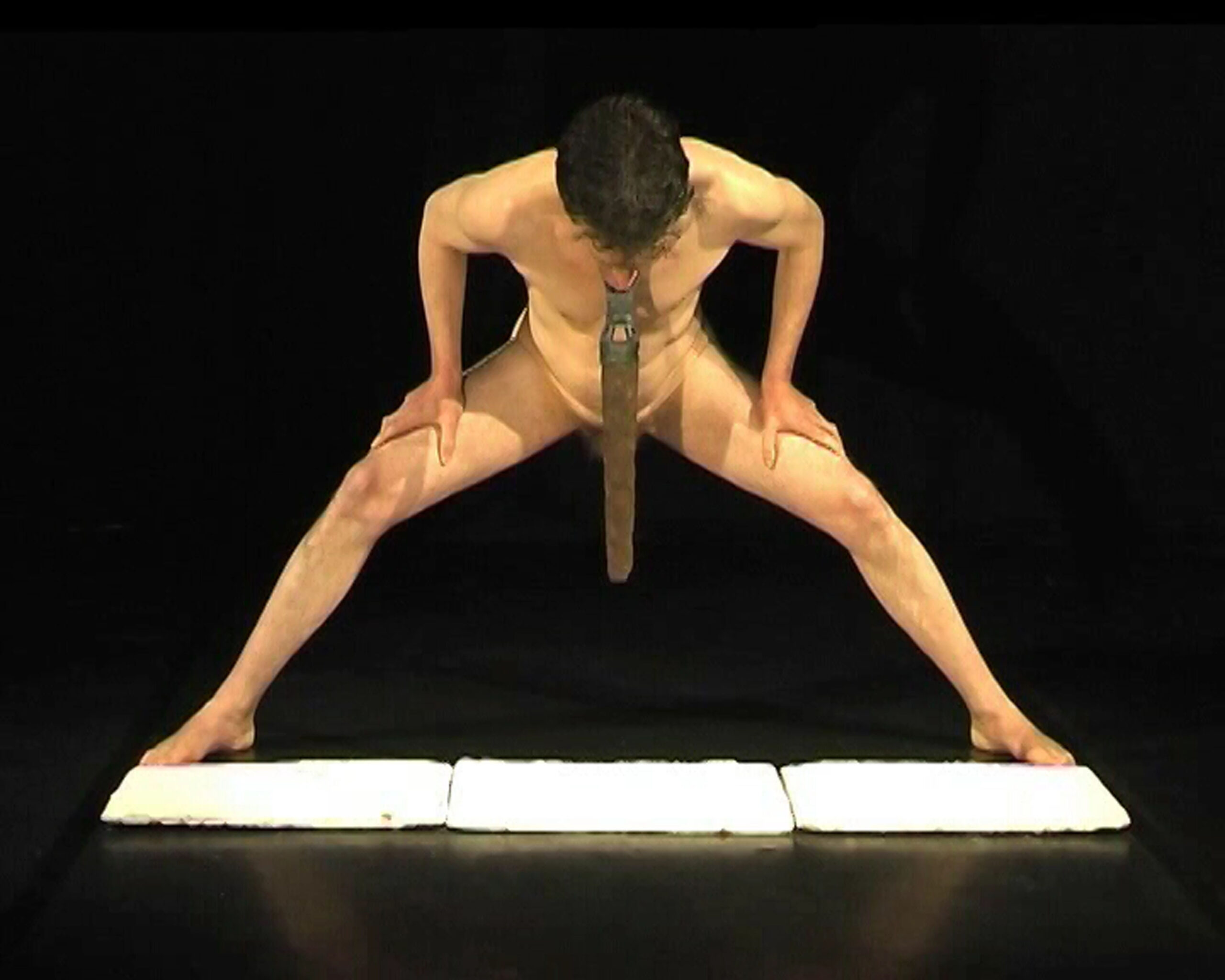 Die Krawatte – Symbol für Ordnung und Disziplin – wird zum schweren Objekt aus Metall. Sie hängt, zieht nach unten, teilt und engt ein.