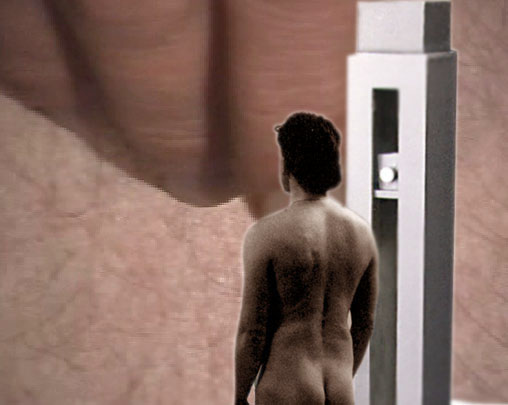 Hautkontakt – Körperweg ist eine multimediale Installation mit partizipativem Ansatz, die den Blick direkt auf die Haut der Teilnehmenden ebenso wie der Zuschauenden lenkt. Im Zentrum steht die Körper-Weg-Aktion: Eine Person befindet sich auf einer Drehscheibe in einem geschlossenen Raum. Während sich der Körper langsam um die eigene Achse dreht, tastet eine Kamera in ruhiger, gleichmäßiger Bewegung die Körperoberfläche ab. Das Objektiv streift jeden Zentimeter Haut und zeichnet Rundungen, Vertiefungen, Faltungen und Behaarungen in extremer Vergrößerung auf.